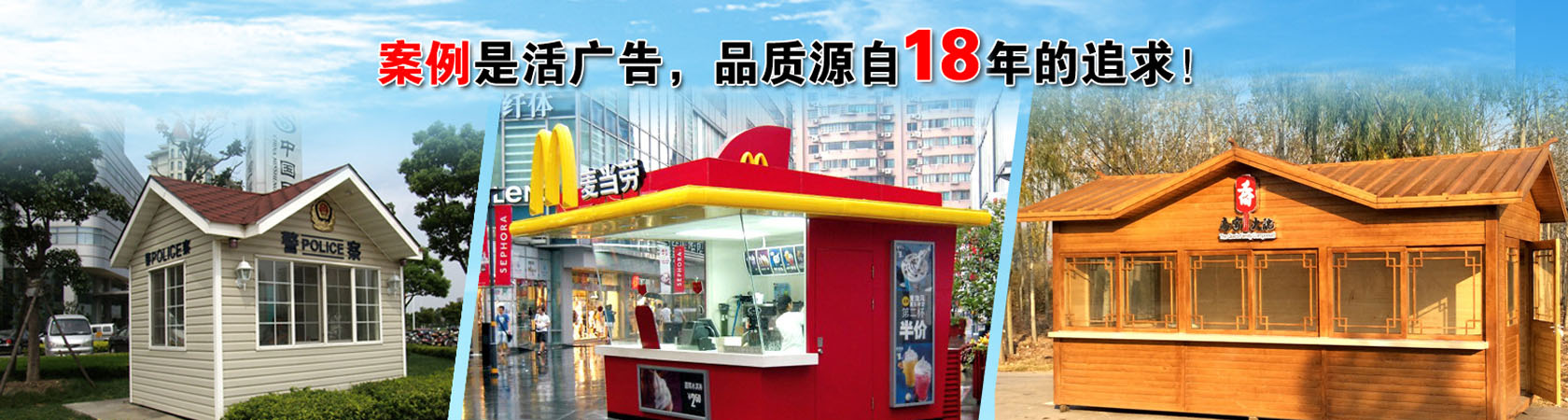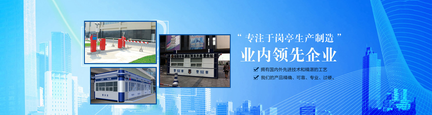 公司主要生產各類崗亭,包括高速公路收費亭系列、治安崗亭、交通崗亭、售貨亭、公交亭、書報亭、小區崗亭等,崗亭材質齊全有:不銹鋼崗亭、鋼結構崗亭、鋁塑板崗亭、玻璃崗亭、木制崗亭、金屬雕花板崗亭、PVC掛板崗亭等,適用于各政府機關、道路交通、機場港口、地產建筑等多個行業領域。